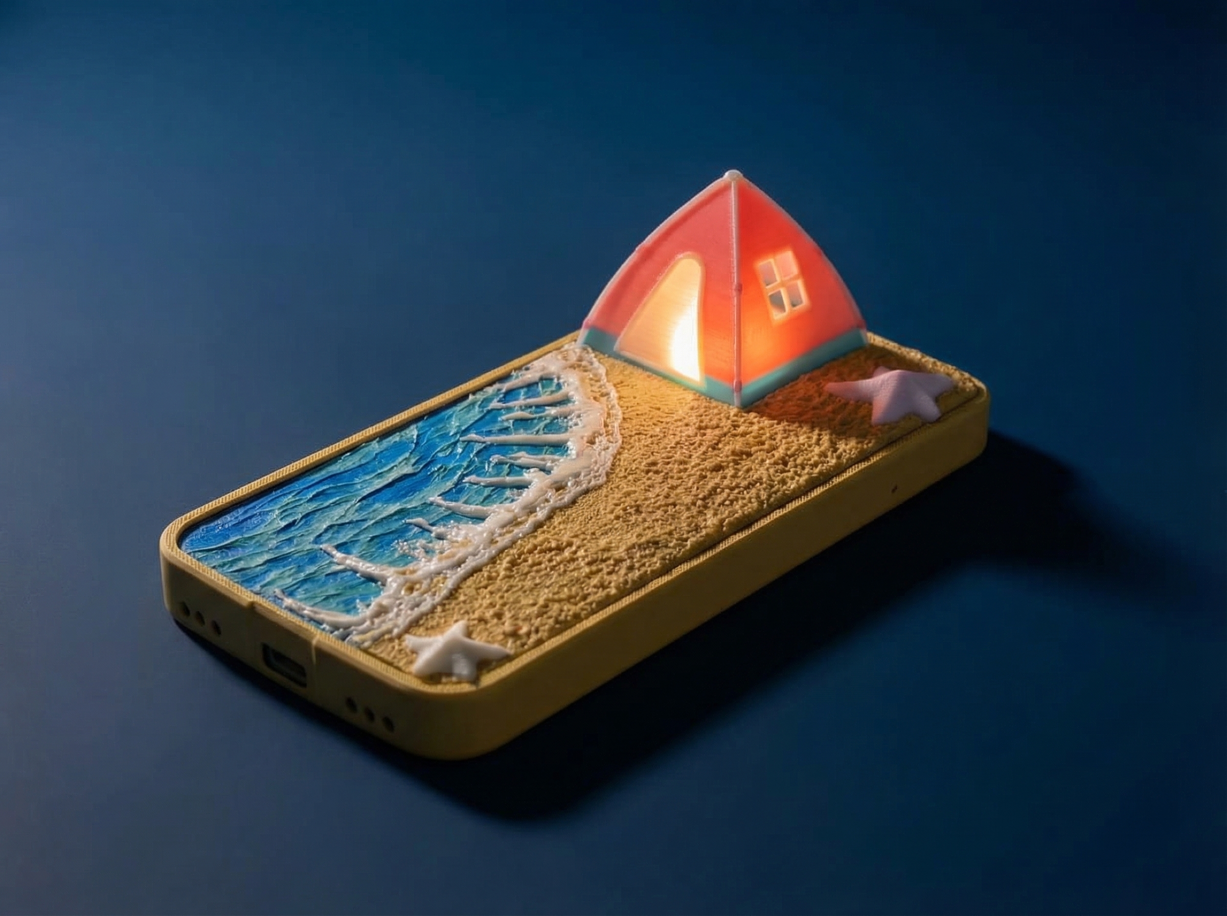Our concept was simple: a relaxing beach campsite. We designed a textured, 3D-printed shoreline where the sand meets the waves. But the real magic happens when you get a notification and the lights up.